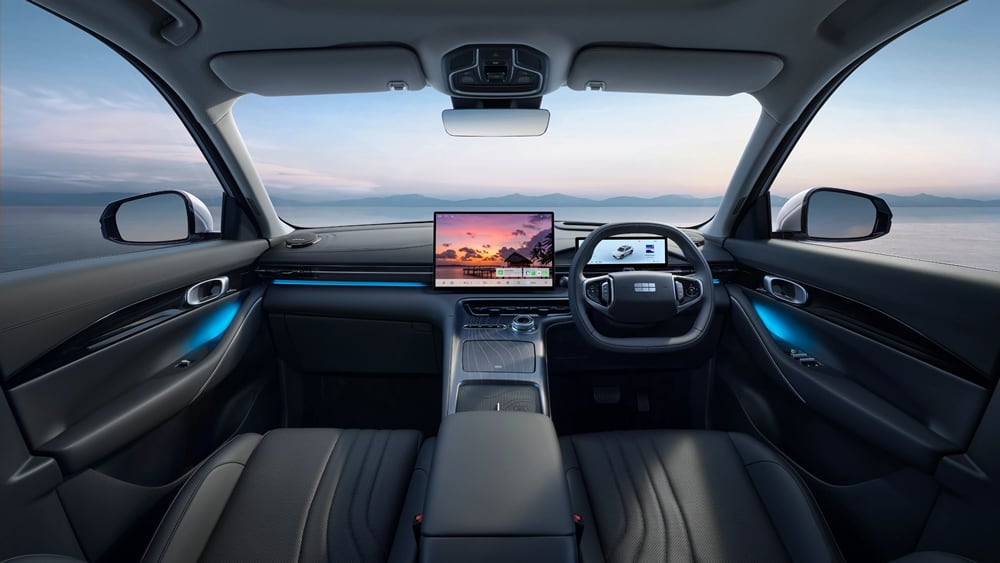 Layout dasbornya clean dengan floating touchscreen infotainment, speedometer TFT digital, serta Head-Up Display (HUD). Di sekitarnya juga minim tombol fisik. Semua kontrol terintegrasi pada head unit 15,4 inci yang sudah mendukung Apple CarPlay, Bluetooth, serta beragam pengaturan lain.