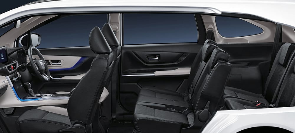 Masuk ke interior Toyota New Veloz Hybrid EV kabin terasa lapang untuk 7 penumpang dewasa. Baris kedua bahkan bisa dikonfigurasi menjadi mode long sofa dengan armrest.